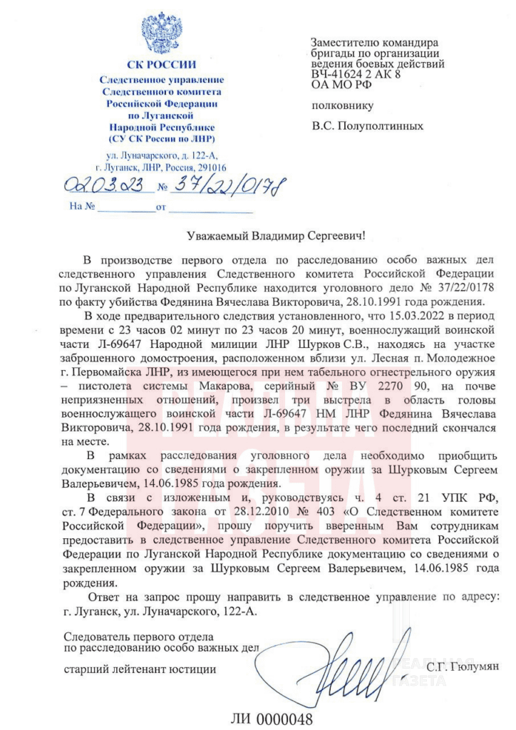 Так, 15 березня 2022 року вночі військовий “народної міліції ЛНР”, старший офіцер на батареї старший лейтенант Сергій Шурков 1985 року народження застрелив командира батареї старшого лейтенанта В’ячеслава Федянина 1991 року народження. Сталося це в закинутому будинку в місті Первомайськ, яке знаходиться на окупованій території Луганської області. Відомо, що Шурков тричі вистрелив в голову Федянину із пістолета Макарова нібито через “неприязні відносини”. Лейтенант Федянин помер на місці.
