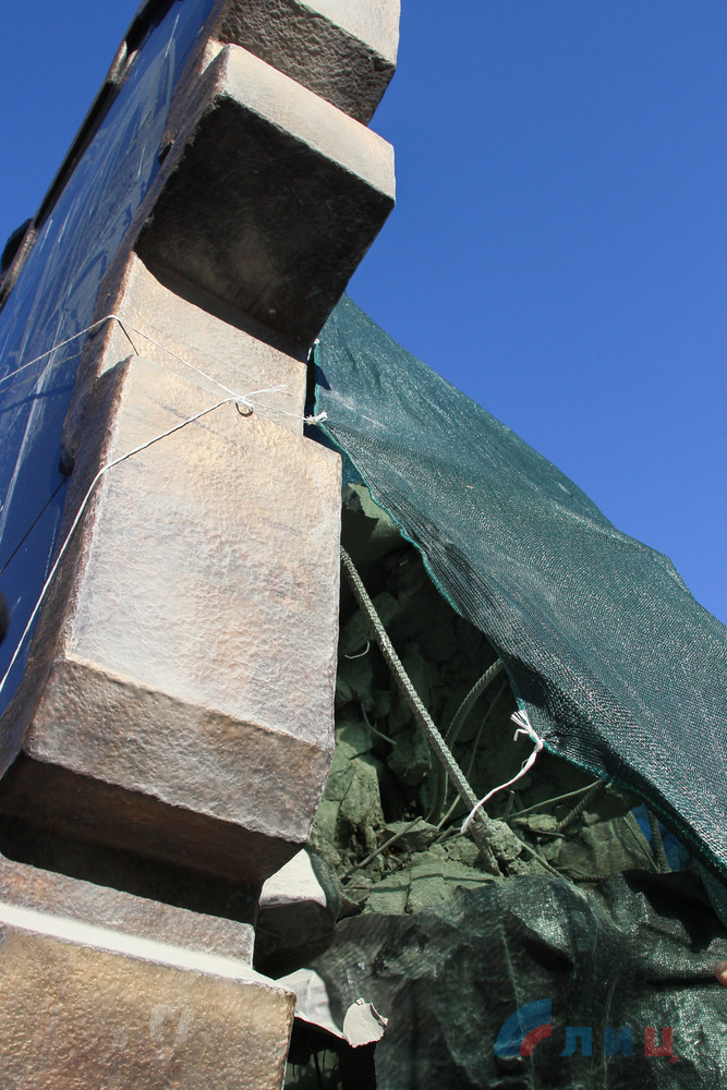 «Ночью 1 августа, находясь в Луганске, наблюдатели слышали 1 взрыв неопределенного происхождения за 1,5-2 км северо-северо-запад. На следующий день на ориентировочно определенном месте взрыва команда СММ видела 2 вооруженных мужчин в одежде военного типа с нашивками «ЛНР» и около 14 рабочих, которые очищали участок. Расположенный там памятник был частично прикрыт брезентом, но наблюдатели не увидели на нем повреждений. По словам присутствовавшего там члена «ЛНР», по приказу его руководства он не может предоставить Миссии никаких сведений. Наблюдатели не зафиксировали повреждений на расположенных вблизи зданий», – говорится в сообщении.
