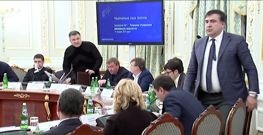Напомним, 14 декабря, заседание Нацрады реформ в администрации президента закончилось скандалом, в ходе которого министр внутренних дел Арсен Аваков то ли облил водой, то ли бросил стаканом с водой в главу Одесской областной государственной администрации Михаила Саакашвили. Также сообщалось, что Аваков и премьер-министр Арсений Яценюк требовали от Саакашвили «убираться из Украины». Все это произошло в присутствии президента Украины Петра Порошенко, который пытался успокоить стороны, а потом закрыл заседание.